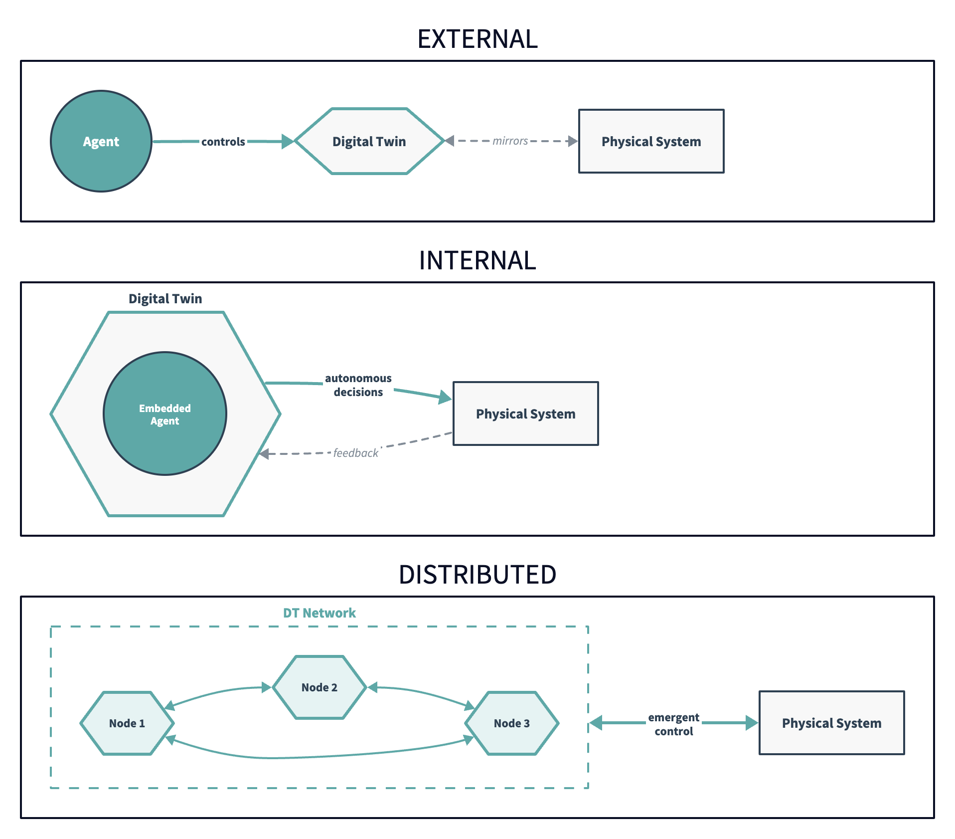 Figure 2: The locus of agency dimension, from external (human-directed) through internal (AI-directed) to distributed (emergent from networked twins).