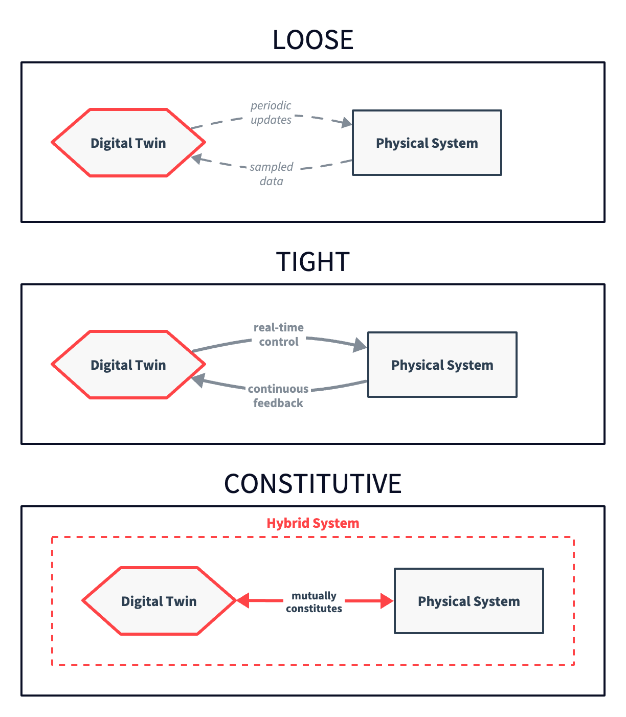 Figure 1: The tightness of coupling dimension, ranging from loose (periodic data exchange) through tight (real-time bidirectional feedback) to constitutive (mutual ontological entanglement).